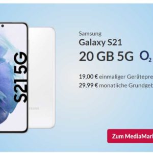 Bei MediaMarkt findet Ihr jetzt das Galaxy S21 (128 GB) zum Tarif o2 Free M mit 29,99 € Grundgebühr. Die Zuzahlung wurde von 85 € auf 19 € reduziert. Wird die Rufnummer zu o2 mitgenommen, gibt es nochmals 100 € Wechsel-Bonus dazu. Nur dann habt Ihr einen effektiv kostenlosen Tarif mit Ersparnis. 🙂 Ich finde es ja schon toll, dass die Zuzahlung nun deutlich geringer ausfällt!