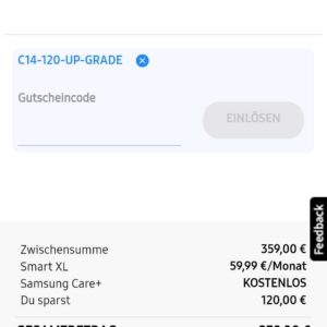 Wer das Handy behält, bekommt auch 1 Jahr Samsung Care+ im Wert von 89 Euro gratis dazu.