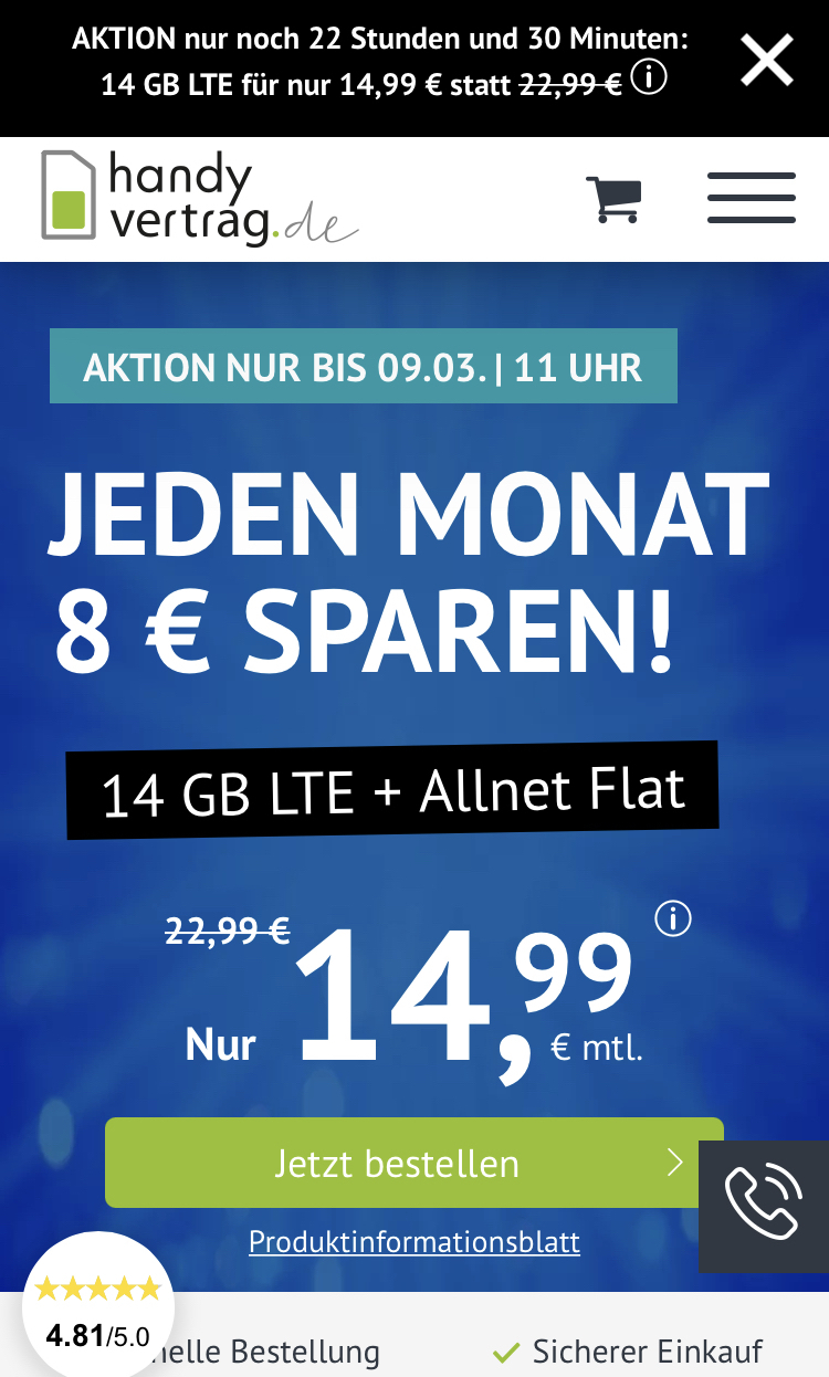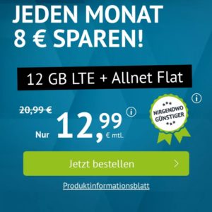 Bei Handyvertrag gibt es aktuell eine 12GB LTE Allnet Flat für 12,99 Euro.