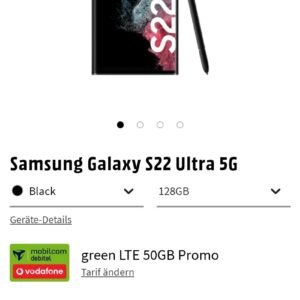 Ab sofort kann man bei MediaMarkt das Galaxy S22 Ultra 128 GB für 49€ mit einem Vodafone Tarif mit 50 GB und bis zu 100 Mbit/s für 44,90€ im Monat bestellen