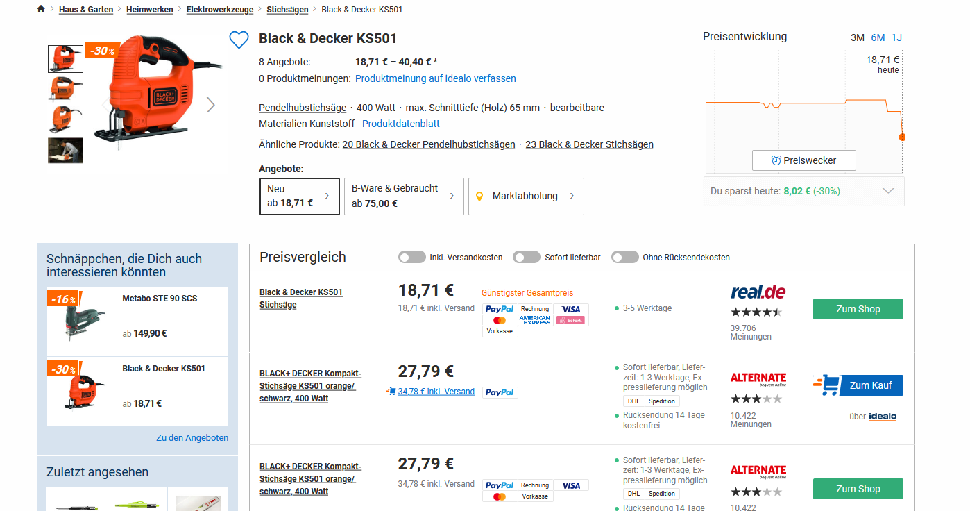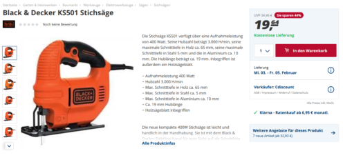 Auf real Online bekommt man derzeit die Black & Decker KS501 Stichsäge 400W für 18,44€ inkl.Versandfrei (PVG ab 34,78€)