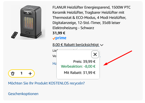 Bei Aamzon gibts den 1500W PTC Keramik Heizlüfter für effektiv 31,99€. (regulärer Preis ~57€) (aktuell: ~39,99€) Ersparnis mindestens ~8€