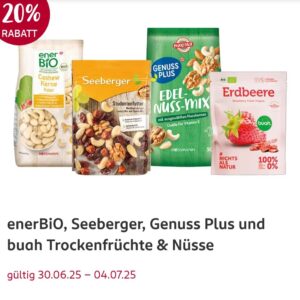 Wer mal wieder seine Vorräte auffüllen möchte, findet in der Rossmann App einen 20%-Rabatt-Coupon für den Kauf von beliebig vielen Trockenfrüchten🍓🍌🍏 und Nüssen 🥜 der Marken enerBio, Seeberger, Genuss Plus und buah.