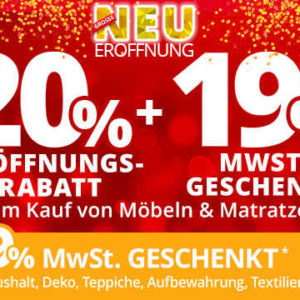 Da gibt es sogar 20% Eröffnungs-Rabatt + 19% MwSt. geschenkt auf Möbel und Matratzen.