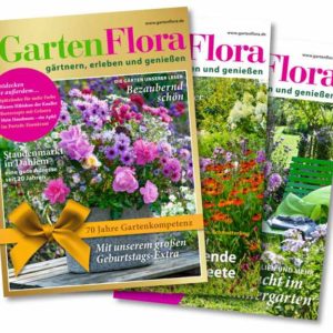 „Anlässlich des 70 Jahre GartenFlora-Jubiläums schenkt Dehner Ihnen das Geburtstagsheft der GartenFlora und zwei weitere aktuelle Hefte. Vor 70 Jahren, im September 1949, erschien die erste Ausgabe der GartenFlora – für uns Anlass, Ihnen drei Hefte der GartenFlora kostenlos und unverbindlich zu schenken. Nach Erhalt der dritten Ausgabe endet der Bezug automatisch – Sie gehen kein Abonnement ein.“