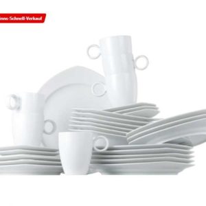 Lieferumfang:6 Becher mit Henkel, 6 Kaffee-Untertassen 165 mm eckig, 6 Frühstücksteller 220 mm eckig, 6 Speiseteller 270 mm eckig, 6 Suppenteller 230 mm eckig