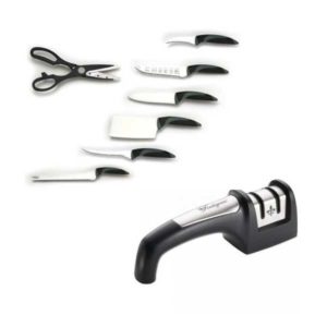Das Set bekommt Ihr für €14,99 vsk-frei. Nächster Bestpreis ist (Amazon) mit €9,99 für das Messerset und (Amazon) mit €9,99 für den Messerschärfer. Beide liefern vsk-frei.