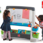 Wenn doch alles so leicht abwischbar wäre, wie diese extra-große Whiteboard-Oberfläche! Quasi nebenbei fördert die Staffelei die Kreativität und verbessert die Feinmotorik von Kindern, indem sie ihnen eine Freifläche zum Zeichnen und Schreiben bietet. Mehrere Kunsthaken sorgen dafür, dass die kleinen Künstler ihre Meisterwerke ausstellen können. Nach Gebrauch garantieren großzügige Behälter und Taschen an der Staffelei, dass das Kunstzubehör schön und ordentlich verstaut werden kann. Ein robuster Unterbau und langlebige Materialien versprechen jahrelangen Spaß.