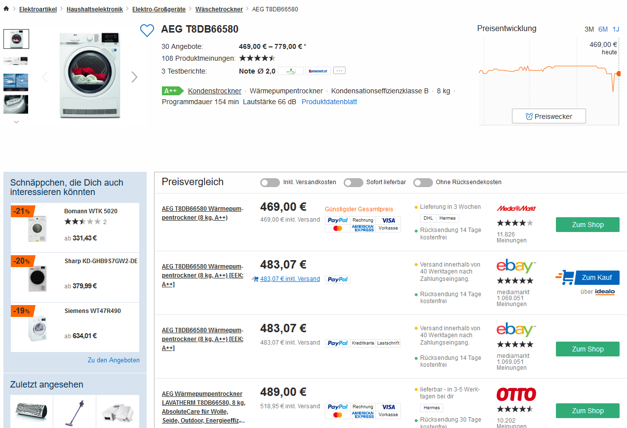 Bei Mediamarkt bekommt man den AEG T8DB66580 Wärmepumpentrockner (8 kg, A++) für 469,00 Euro inkl.Versandfrei PVG ab 519,00 Euro