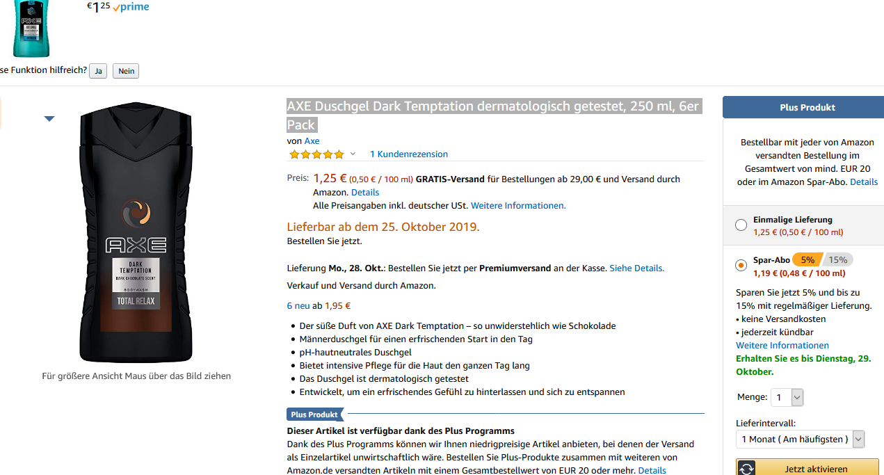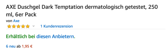 Schnell sein ist alles, bei Amazon AXE Duschgel Dark Temptation dermatologisch getestet, 250 ml, 6er Pack als Plus Produkt für 1,25 Euro