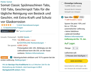 Bei Amazon könnt ihr 150 Somat Classic Geschirrspül Tabs für nur 10,39 € bestellen. Dafür müsst ihr einmal auf der rechten Seite die Option Spar-Abo auswählen und zusätzlich den 10% Rabattgutschein unter dem Preis einlösen. Die Lieferung ist mit Amazon-Prime kostenlos.