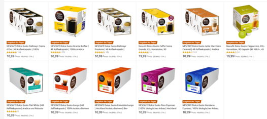 Im Tagesangebot von Amazon gibt es heute verschiedene Sorten von Nescafe Dolce Gusto Kapseln.