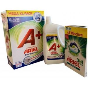 Ariel Professional Waschpulver (265 WL) + Ariel Professional flüssig (100 WL) + 2x Ariel 3in1 Caps (48 WL), insgesamt 413 WL (12 Cent/ WL) für 50,95 € + 6,95 € VSK statt 79,99 €