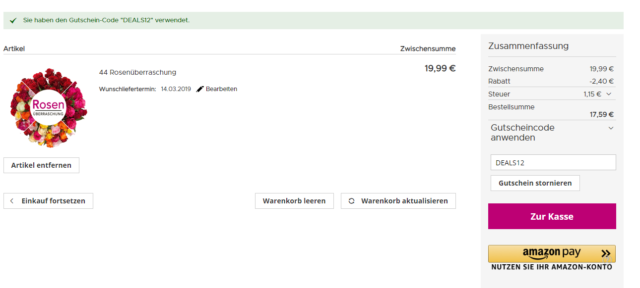 lemalix 13.03.2019, 08:51 #Mit dem Gutschein-Code DEALS12 spart man zusätzlich 12% auf dem Strauß Preis, also nochmals 2,40€ günstiger!