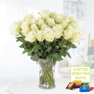 40 weiße Rosen + 2 Mini Ritter-Sport + Grußkarte für 24,90€
