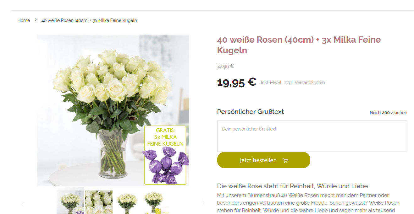Im Blumenshop bekommt ihr gerade einen Strauß mit 40 weißen Rosen für 19,95€. Hinzu kommen noch 4,95€ Versand, sodass ihr am Ende 24,90€ zahlt.