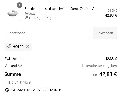 Bei Bookiepad bekommt man bis einschließlich 21.07.2024 mit einem Rabattcode 22% Rabatt auf ein ausgewähltes Sortiment. U.a. dem Bookiepad Lesekissen.