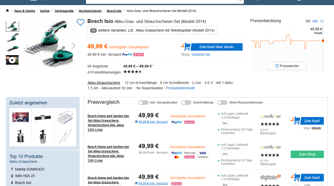 Bei Amazon nur für PRIME Kunden bekommt man den Bosch Akku Grasschere Set Isio (3,6 Volt, Messerlänge 12cm, Messerabstand 8 mm, im Karton)für 44,99 statt PVG ab 49,99 Euro inkl.Versand.