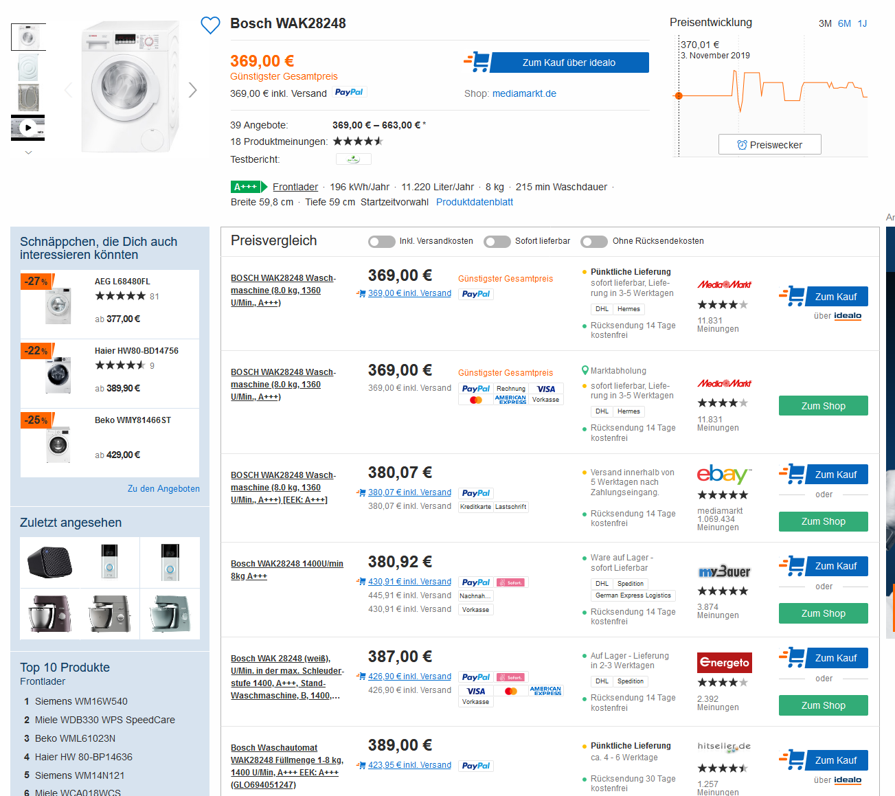 Bei Mediamarkt bekommt man derzeit für 369,00 Euro inkl.Versand den BOSCH WAK28248 Waschmaschine (8.0 kg, 1360 U/Min., A+++) PVG ab 424,00 Euro
