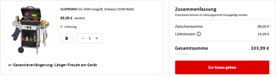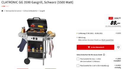 Bei MediaMarkt bekommt man derzeit CLATRONIC GG 3590 Gasgrill, Schwarz (5500 Watt) für 89€ Versandfrei statt PVG ab 105€