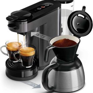 Mit der „Senseo Switch Pad- und Filterkaffeemaschine HD6591/20CO“ kann man wählen zwischen dem umweltfreundlicheren Filterkaffee in der Kanne oder den, bei vielen unbeliebten, Kapselkaffee. Das ist wenigstens noch eine gute Alternative zu den reinen Kapselmaschinen.