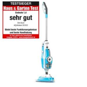 Der Dirt Devil AQUAclean 2in1 Multifunktions-Dampfreiniger DD302 erhält die Note sehr gut (1,4) und ist damit Testsieger! Die Zeitschrift „Haus & Garten Test“ bezeichnet das Gerät als „Überzeugendes Gesamtpaket ohne Schwächen“. Der Aquaclean 2in1 Multifunktions-Dampfreiniger bestach mit besten Funktionsergebnissen und bester Handhabung.