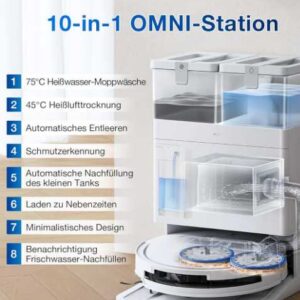 - 【OMNI-Station mit automatischer Reinigungsmittelzugabe】 Die All-in-One-OMNI-Station bietet erweiterte Funktionen, darunter automatisches Entleeren, Heißlufttrocknen bei 45 °C und automatische Reinigungsmittelzugabe. Durch die bidirektionalen Schabern und das Wischmoppwaschen mit 40-75 °C heißem Wasser reinigt sie sowohl den Mopp als auch die Basis durch automatische Selbstreinigung.