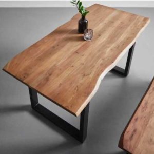 „Dieser attraktive Esstisch in Braun und Schwarz bietet Ihnen einen gemütlichen Essplatz zum Speisen. Die Kante in Baumform verleiht der Tischplatte aus massivem Akazienholz eine besonders individuelle Optik. Die kufenförmigen Füße aus Metall in Schwarz sorgen für stabilen Stand.“