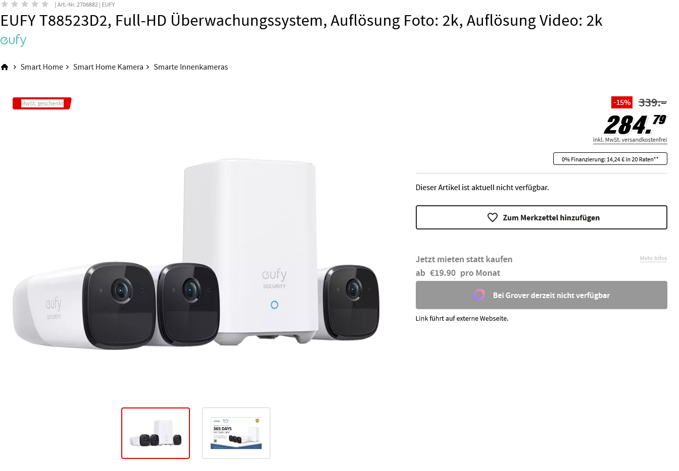 Bei Saturn&Mediamarkt bekommt man die EUFY T88523D2, Full-HD Überwachungssystem, Auflösung Foto: 2k, Auflösung Video: 2k für 339€ inkl.Versand PVG ab 385€