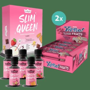 „So lecker kann der Sommer sein! Sichere dir die beliebten Tasty Drops Geschmackstropfen in 5 Sorten deiner Wahl! Die Tropfen eignen sich zum Süßen von Speisen und Getränken. Un das Beste ist, dass sie kalorienfrei und somit auch zuckerfrei sind!Mit dem Slim Queen Probierset kannst du die meist-gekauften Sorten ausprobieren und dich selbst vom tollen Geschmack unseres Slim Queen Abnehm-Shakes* überzeugen.Die Yippie Fruits Proteinriegel runden das Bundle ab: High Protein und fruchtig-lecker!“
