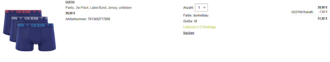 Tayfun 16.04.2019, 07:42 #Ein Beispiel Guess GUESS, Pants, 3er-Pack, Label-Bund, Jersey, unifarben für 35,87 statt PVG 40,95 Euro