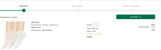 Um den Rabatt zu erhalten einfach Aktionscode waesche20ok im Warenkorb eingeben und auf „einlösen“ klicken. Nicht mit anderen Rabatten kombinierbar. Ausgeschlossen sind folgende Marken und Filialen>.