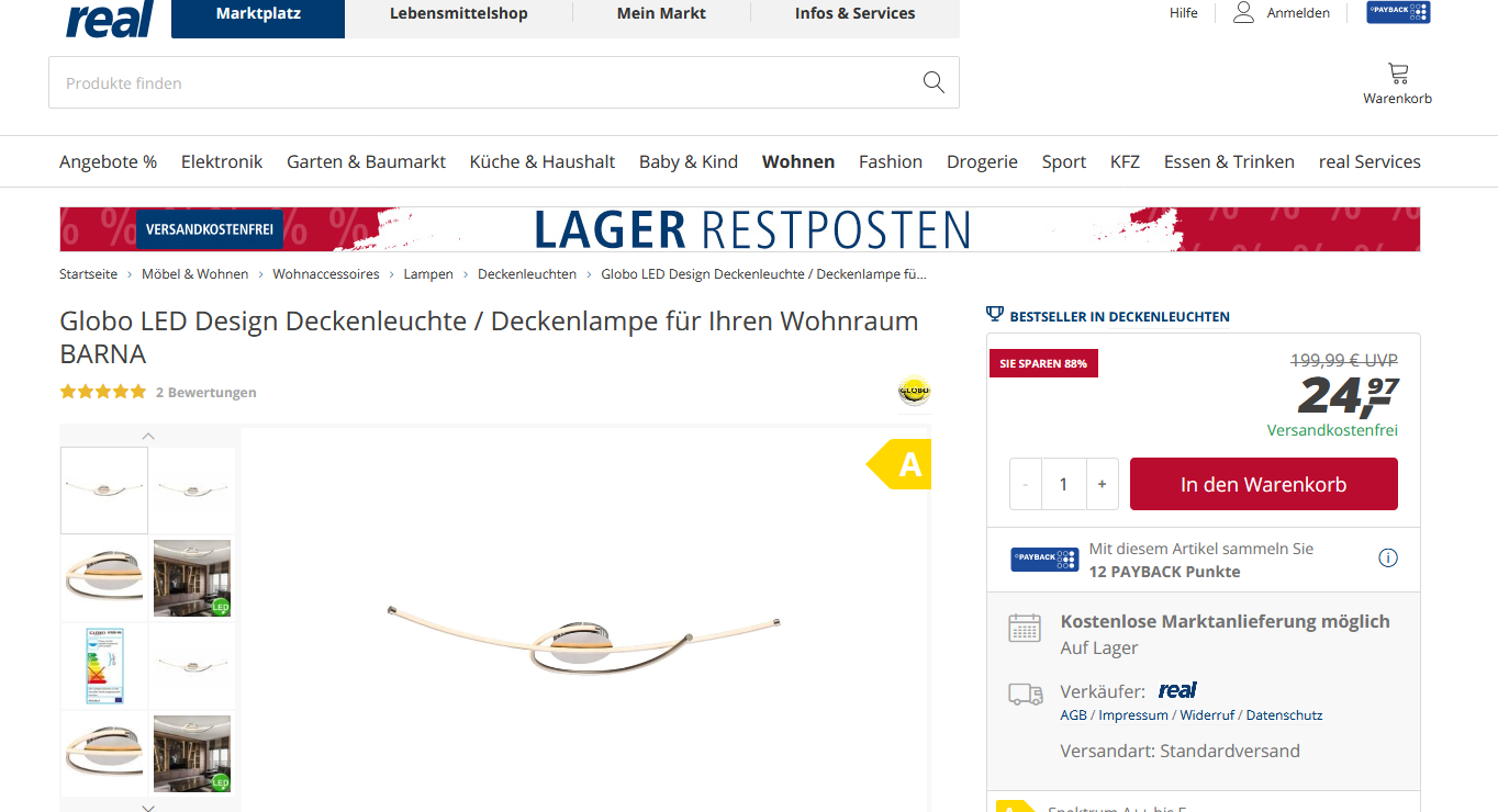 Bei real bekommz ihr den Globo LED Design Deckenlampe BARNA für 29,97 statt PVG ab 69,60 Euro inkl.Versandfrei