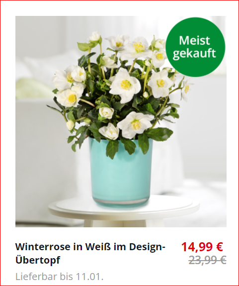 lemalix 28.12.2018, 07:10 #Alternativ auch sehr stark rabattiert gibt es die Winterrose in Weiß im Design Übertopf für 14,99€ (zzgl. 4,99€ Versand) statt 23,99€.
