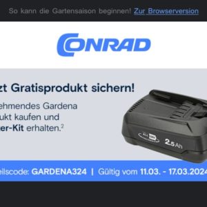 Bis Sonntag kann man bei Conrad ein Starter-Kit von Gardena gratis als Bestellzugabe erhalten (bestehend aus Akku & Ladegerät im Wert von 79,99 € UVP).
