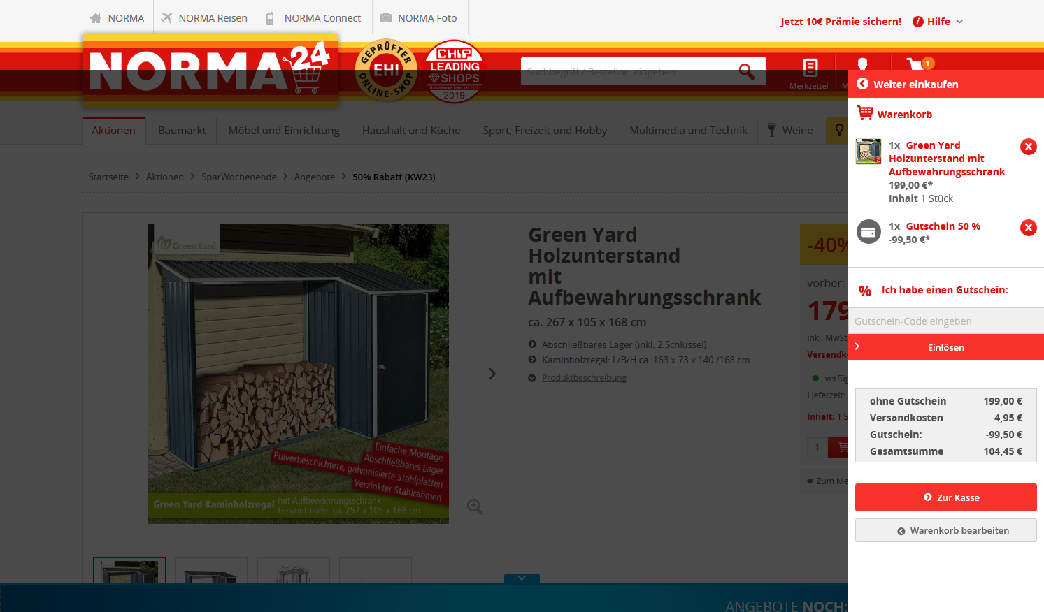 Bei Norma24 bekommt ihr mit dem Gutscheincode:Coupon50 den Green Yard Holzunterstand mit Aufbewahrungsschrank für 104,45 statt 179,10 Euro inkl.Versand.