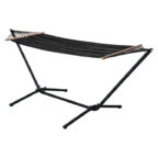 Dieses bequeme Hängematten-Set lädt zum Entspannen und Verweilen ein. Die großzügige Liegefläche trägt bis zu 100 kg und besteht aus Polyester und Baumwolle. Dadurch ist ein hoher Liegekomfort garantiert. Das pulverbeschichtete Stahlgestell sorgt außerdem für die nötige Stabilität. Aufgrund seiner Materialbeschaffenheit ist das Hängematten-Set einfach und schnell zu reinigen.