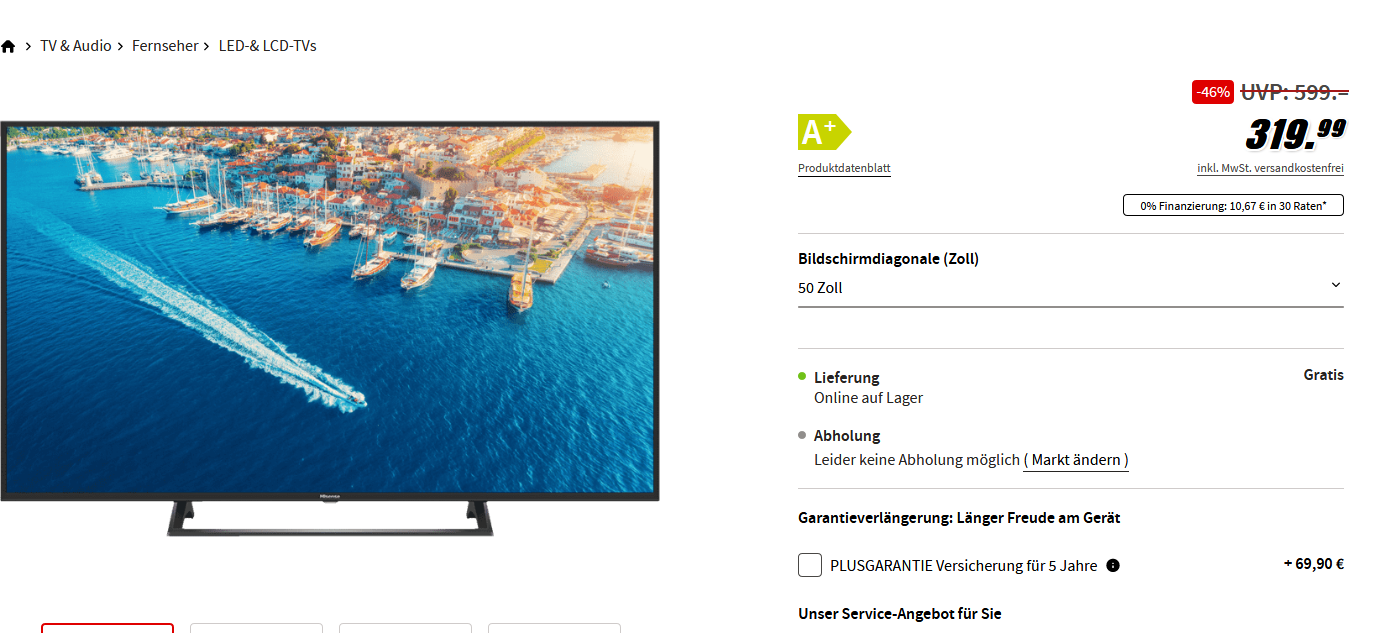Bei abholung in Mediamarkt bekommt man derzeit die HISENSE H 50 B 7300 LED TV (Flat, 50 Zoll/126 cm, UHD 4K, SMART TV, VIDAA U3.0) für 335,99 statt PVG ab 449,00 Euro