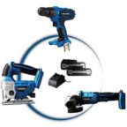 Ein SET von 3 Akku-Elektrowerkzeugen, bestehend aus einem Bohrschrauber, einem Winkelschleifer und einer Stichsäge.