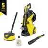 Der Kärcher Hochdruckreiniger K 5 Premium Smart Control Home mit Schlauchtrommel eignet sich mit einer Flächenleistung von 40 m²/h. ideal für regelmäßige Reinigungen gegen mittelstarken Schmutz, inkl. Home Kit mit Flächenreiniger T 5 T-Racer. Dank des verstellbaren Düsenabstands kann der T 5 auf harten wie auch auf sensiblen Flächen eingesetzt werden. Der Boost Mode liefert zusätzliche extra Power gegen den Schmutz, steigert die Reinigungseffizienz und spart Zeit. Er ermöglicht eine kraftvolle Spot-Reinigung, auch bei hartnäckigen Verschmutzungen. Mit der Smart Control-Pistole mit LCD-Display und Tasten zur Druck- oder Reinigungsmitteldosierung findet man für jede Oberfläche den passenden Druck. Das drehbare 3-in-1 Multijet Strahlrohr beinhaltet drei verschiedene Düsen, die sich einfach wechseln lassen. Dank des höhenverstellbaren Teleskopgriffs kann man das Gerät in bequemer Ziehhöhe bewegen und kompakt lagern. Außerdem überzeugt der K 5 Premium Smart Control Home mit einem tieferen Gewichtsschwerpunkt für mehr Stabilität, der praktischen Schlauchführung sowie einem stabilen Standfuß. Der Standfuß kann auch als zweiter Tragegriff verwendet werden, wodurch sich der K 5 Premium Smart Control Home ganz leicht in ein Regal oder in den Kofferraum heben lässt.