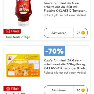 Mit der Kauflandcard bekommt ihr auf 3 Produkte von der Kaufland Eigenmarke 70% ab einem Mindesteinkaufswert von 25€ (30€).