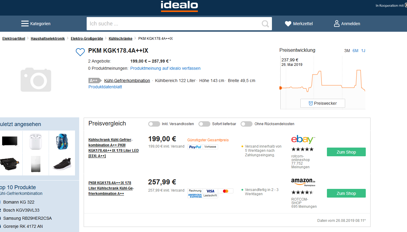 Bei ebay bekommt man inkl.Versand den Kühl-Gefrierkombination A++ PKM KGK178.4A++IX 178 Liter LED für 199,00 statt PVG 257,99 Euro.