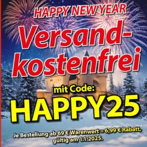 Zusätzlich gibt es NUR HEUTE eine versandkostenfreie Lieferung bei Nutzung des Rabattcodes HAPPY25 (gültig am 1.1.2025)