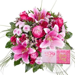 Bestandteile: 2 pinkfarbene Lilien, 4 rosafarbene Rosen, 2 pinkfarbene Spraynelken, 3 rosa-weiße Santini – arrangiert mit Limonium, Aralienblättern, Pistazie und Beargräsern (Durchmesser 30 cm) zzgl. 1 Vollmilchschokolade „Heute ist DEIN TAG“ (100 g)