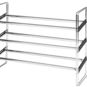 Das Schuhregal verfügt über insgesamt drei Ablagen, die Platz für ungefähr 12 bis 15 Paar Schuhe bieten. Es ist ausziehbar, was bedeutet, dass es flexibel an die jeweilige Raumsituation angepasst werden kann. Hergestellt ist es aus verchromtem Metall. Die Ablagen können entsprechend der Schuhgröße individuell eingestellt werden.