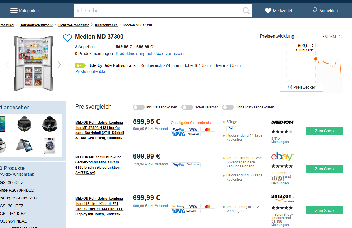 Bei Medion beokommt man derzeit den MEDION® Kühl-Gefrierkombination MD 37390, 418 Liter Gesamt-Nutzinhalt (274L Kühlteil & 144L Gefrierteil), automatische Abtaufunktion für 599,99 statt PVG ab 699,99 Euro inkl.Versand.