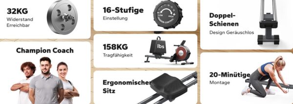 - MERACH App, Smart Training: Verbinden Sie sich per Bluetooth mit der MERACH App, um Ruderdaten, Trainingsfortschritte und Kalorienverbrauch in Echtzeit zu verfolgen und personalisierte Trainingspläne zu erstellen.