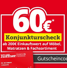 Gebt den Gutschein KONJUKTUR ein. Die Aktion gilt nur für Kundenkarteninhaber. Ihr könnt euch hier eine kostenlose Kundenkarte machen: https://www.hoeffner.de/family-friends