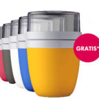 Hab Dein Lieblingsmüsli immer und überall dabei! Dank 2 separaten Behältern kannst Du es mit Milch, Joghurt oder Obst frisch zusammenmixen. Exklusiv bei uns: ein Müsli 2Go Becher mit neuem, extra großem Deckel und noch mehr Platz für Deine Kreativität (oder circa 100 Gramm Müsli). Sicher Dir Deinen perfekten Frühstücks-Begleiter gratis* – in 5 stylischen Farben.