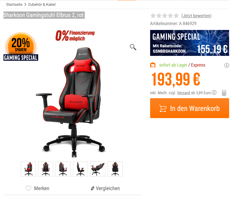 Wer aktuell auf der Suche nach einem günstigen aber solidgen Gamingstuhl ist, der sollte sich das Angebot bei Nootebooksbilliger mal anschauen. Hier gibt es aktuell 20% Nachlass auf den Sharkoon Elbrus 2 (Test: https://gaming-stuhl.de/sharkoon-elbrus-2-test/)
